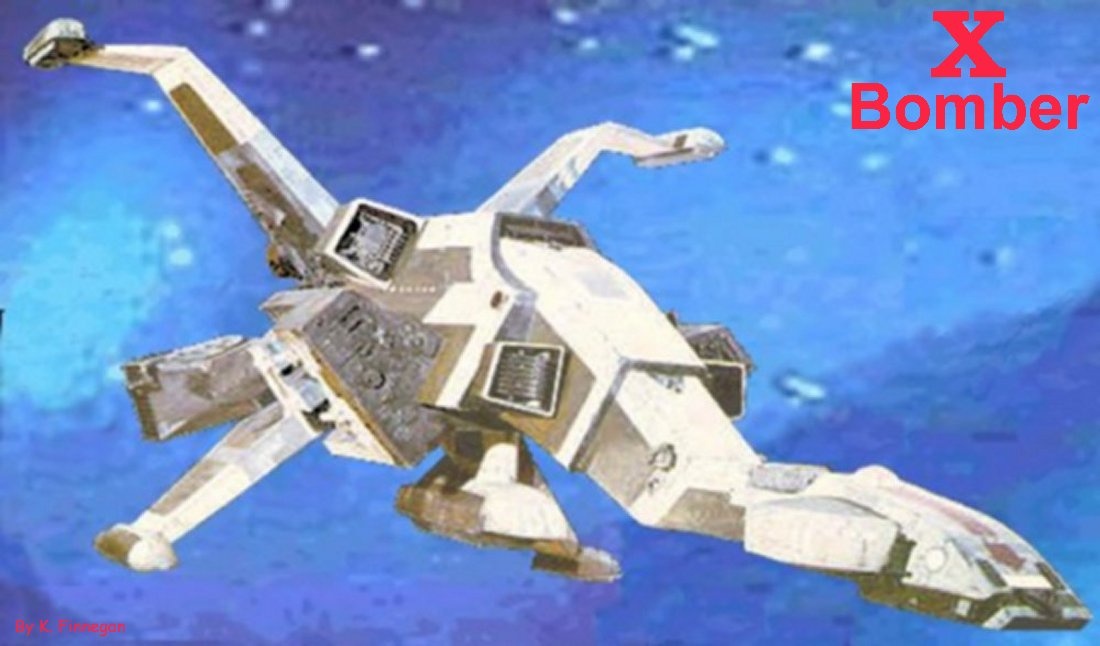 - Side elevation blueprint of the X-Bomber top right with the SF logo, again on a dark background and the same resolution as the portraits wallpaper.